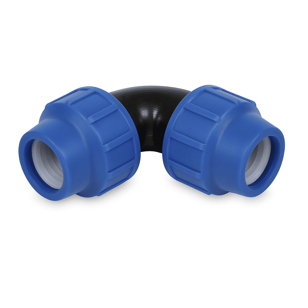 Cotul de compresiune la 90° PN16 este proiectat pentru schimbarea direcției traseelor de conducte din polietilenă. Se montează rapid și asigură o etanșare perfectă fără necesitatea sudurii, fiind ideal pentru sisteme de alimentare cu apă sub presiune.