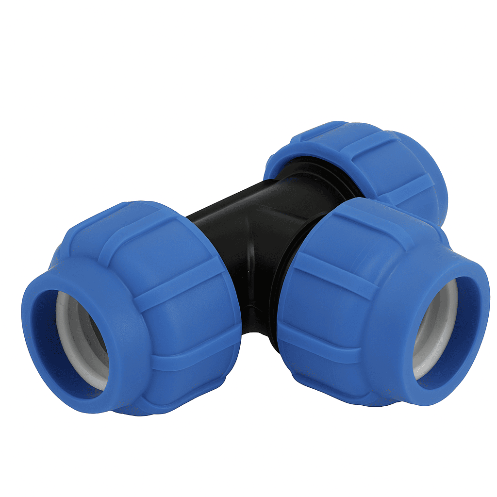 Teul de compresiune egal PN16 este utilizat pentru ramificarea conductelor din polietilenă de același diametru. Este ideal în rețelele de distribuție a apei, irigații, instalații agricole sau industriale, oferind o conexiune sigură și etanșă.